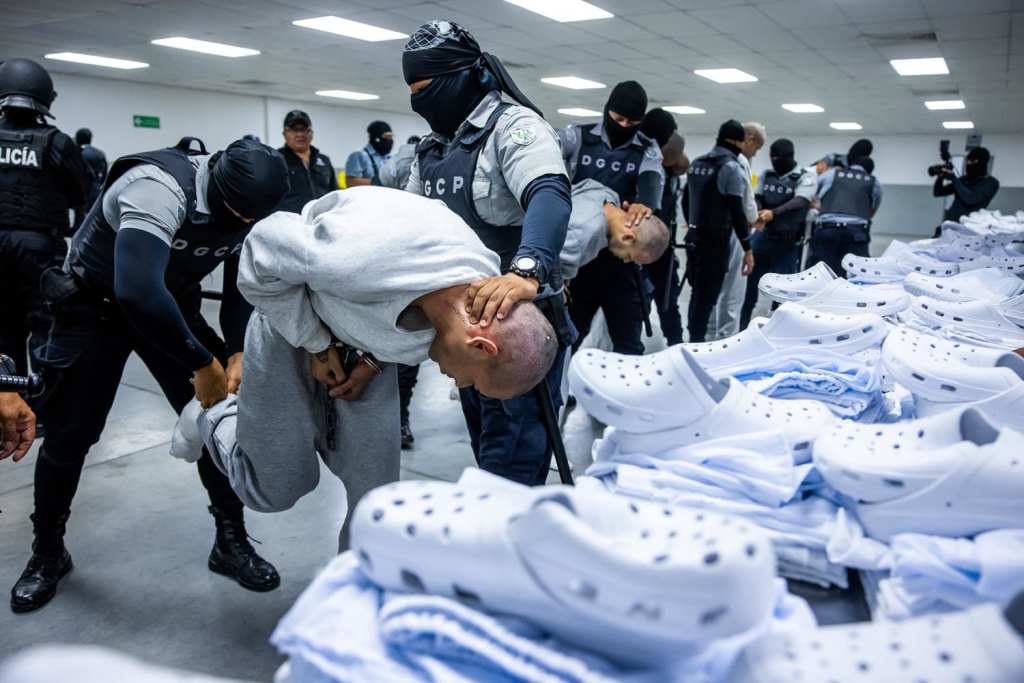 Alleged members of the Venezuelan criminal organization Tren de Aragua and from the Salvadoran gang MS-13 being subdued upon their arrival at the Terrorism Confinement Center in the city of Tecoluca, El Salvador, in an image released on March 31.